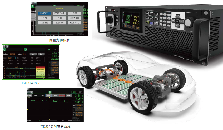 無論是燃油汽車還是新能源汽車,各大車廠和行業組織都制定了一系列技術發展及標準規範,對各種類型的車輛測試進行明確規定。IT6600C系列內置了九種標準的汽車法規測試波形,包括LV123、LV148、ISO21780、ISO21498-2等,用戶可以直接從機器的面闆上調用這些測試波形,進行性能測試。還可以通過“示波功能”,查看波形的實時曲線,無需再外掛示波器或是通過上位機軟件查看,相較於其他競爭産品,省力又省錢。