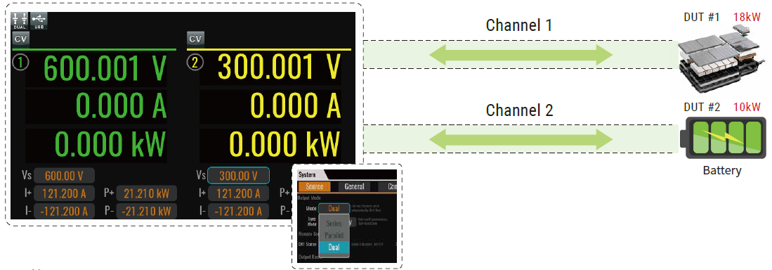 IT6600C系列在3U的機框内實現雙通道21kW輸出,每個通道都是完全獨立的隔離設計,可以獨立控制和量測。IT6600C系列又同時兼具源載功能,所以可以實現通道1(Ch1)提供電源輸出,通道2(Ch2)作爲負載進行拉載,真正的當做2台機器去使用。兩個通道之間還可以進行串聯與并聯,增加IT6600C系列的輸出範圍,應對複雜多變的測試需求。